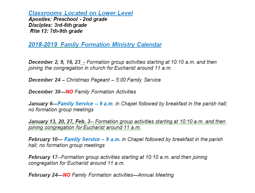 Family Formation classes and activities begin at 10:10 A.M. on most Sunday mornings. At 11 A.M. the children and youth will join their parents at the exchange of the peace, allowing everyone to partake in the Eucharist together.